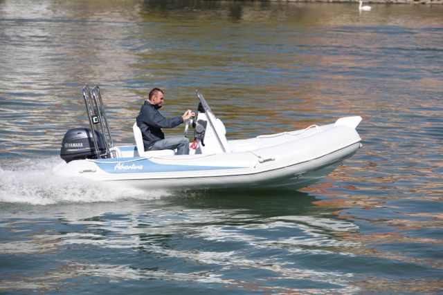 Kot sem že omenil, Adveture ltd projektira svoje čolne z globokim V profilom, kar zagotavlja veliko smerno stabilnost in praktično zniči nagibe med zavoji. Na krmo je bila pritrjena izvenkrmna Yamaha z 29,8 kilovati moči (40 ks), kar je primerno za to velikost čolna in tudi sam večjega oziroma močnejšega motorja ne bi svetoval. Test smo tokrat opravili kar na Dravi ob mariborskem Lentu. Dokler sem bil na čolnu s še enim potnikom, je čoln pospeševal izjemno hitro. Praktično v trenutku se je dvignil iz vode in mirno zdrsel prek gladine. V zavojih deluje izjemno stabilno, propeler pa tudi med najmočnejšim zavojem ne potegne zraka. Moteča pa je predvsem velika centrifugalna sila, ki je čoln brez nagibanja v zavoju seveda ne more kompenzirati in je zato za potnika nekoliko naporna, saj se ji mora sam upirati.