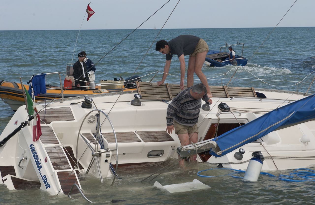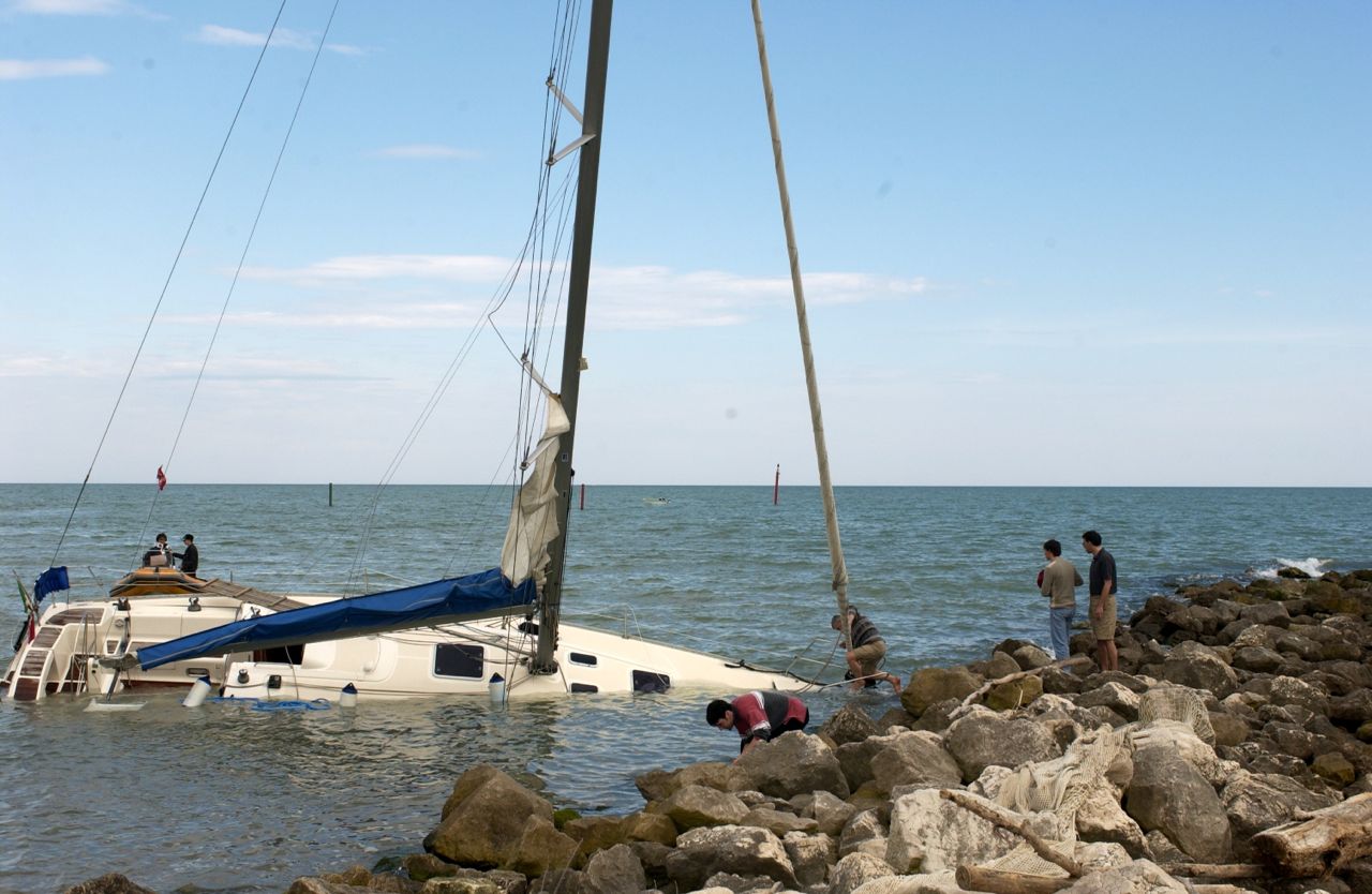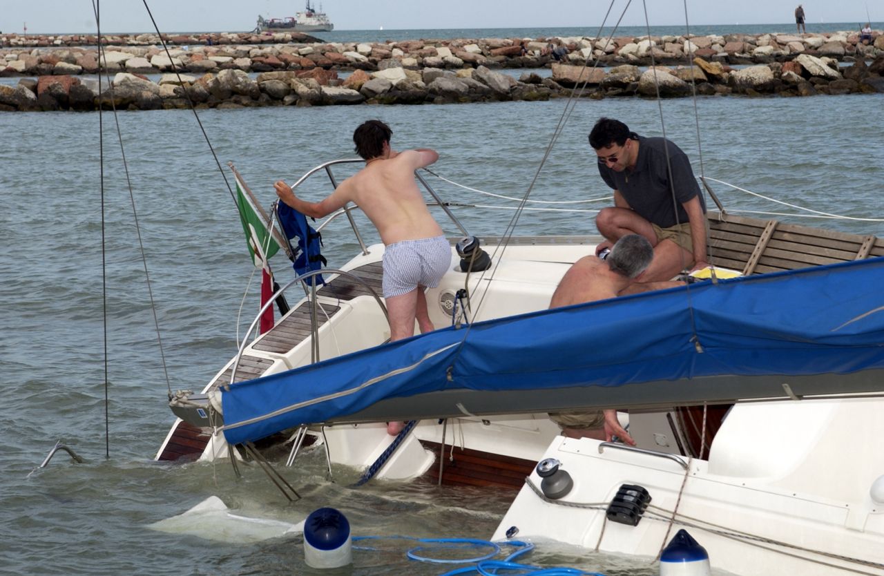Barka se je zaradi močne burje, verjetno pa tudi zaradi plime, očitno iztrgala iz mulja, zato smo seveda predvidevali, da nas bo vrglo v skalnat valobran. Barko smo se odločili zapustiti, ko smo bili od skal oddaljeni le še kakšnih dvajset, morebiti trideset metrov. Bila je tema, morje pa kalno, tako da se globina ni videla. Sinu, ki je sicer odličen plavalec, sem okoli prsi namestil varovalno vrv, nakar se je kot izvidnik pognal v morje. No, nato pa je sledil malce komičen trenutek. Luka je skočil v morje, ki pa je bilo tam, kamor nas je odneslo, globoko le do pasu. Ko smo to videli, smo tudi preostali zapustili barko. Prebrodili smo do obale in splezali na skale, kjer smo premočeni in prezebli obsedeli. V temi smo videli le oddaljene rotacijske luči karabinjerjev in gasilcev. Šele takrat se je od nekod pojavil gumenjak in nas z valobrana preko lagune prepeljal do obale. Nato smo se peš odpravili v klubske prostore krajevnega jadralnega kluba. Mimogrede, laguni, preko katere so nas po potopu prepeljali, ima pomenljivo ime Laguna del Mort.
