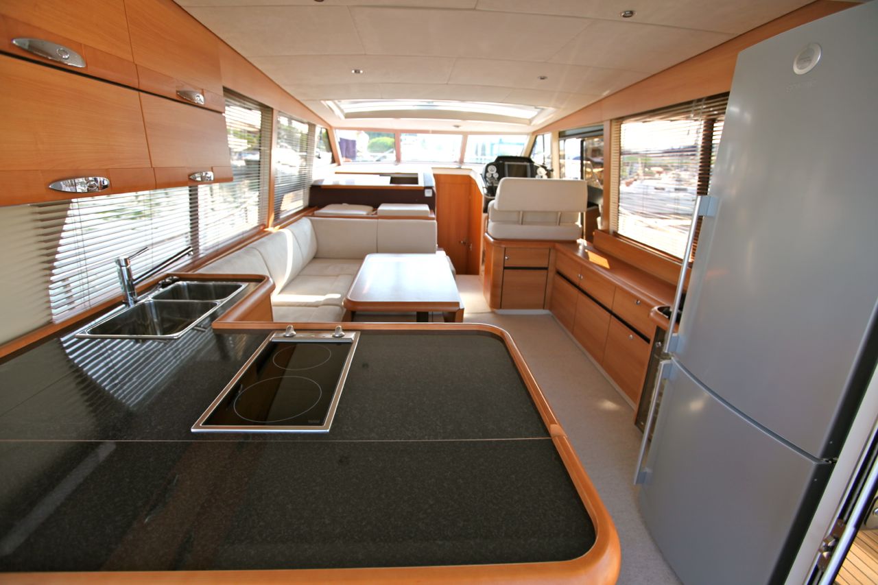 V salon se vstopa skozi drsna vrata iz kokpita ali, z dovoljenjem krmarja, z desnega boka mimo krmarskega dela. Pravi, uradni vhod pa je iz kokpita, kjer se razen drsnih vrat odpira oziroma dvigne še predelna steklena stena, kar poznamo že pri manjšem modelu 33. Tako je ves bivalni prostor od kopalne ploščadi, mimo kuhinje in sedežne garniture, do krmarjevega prostora v enem nivoju brez ene same stopnice. Če se vrnem k vhodu, je na desni hladilnik zastrašujočih dimenzij, ki ga marsikdo ne more spraviti v garsonjero. Seveda je vzrok takšnemu udobju napeljava z 220 Volti, ki omogoča uporabo vseh običajnih kuhinjskih aparatov. Nasproti je na levi kuhinja, kjer bi osebno raje videl plinski štedilnik namesto električnega, a če že barko poganja elektrika, naj bo še štedilnik v stilu. Nasploh pa kuhinja z dvojnim pomivalnim koritom in obilico predalov ter omaric, umeščena med kokpit in salon, omogoča užitek ob pripravljanju hrane, saj je zelo odprta (beri: na prepihu) in kuhar ne bo trpel pretirane vročine. Leva stran salona je dalje rezervirana za sedežno garnituro, nasproti katere je na desni nizka omara s televizorjem, ki se dviga in spušča na komando. Inovativen je levi del pred prehodom v premec, kjer je precej veliko, privzdignjeno in oblazinjeno sedišče, namenjeno potnikom, ki se želijo med plovbo družiti s krmarjem. Nekakšna posebnost je drsno okno na levi v salonu nad kabino za goste, ki se odpira in omogoča boljši pretok zraka, obenem pa služi ta del kot podlaga za navigacijske karte.