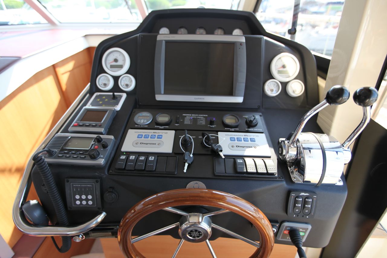 Pri najnižjih vrtljajih (900 vrt/min) in hitrosti 3,2 vozla kaže instrument porabo 1,4 litra po motorju, pri maksimalnih 4.200 obratih in izmerjeni hitrosti 18,6 vozla, pa je poraba goriva nekaj pod 30 litrov po motorju. V primerjavi z manjšim modelom je greenline 40 neprimerno tišji, mirnejši in brez vibracij. Čutiti je res izjemno razliko. Kljub ugodni porabi 16 litrov po motorju na uro in hitrosti 14 vozlov, ki je optimalna hitrost za hitro križarjenje, je pravi užitek izpodrivna plovba z dobrimi osmimi vozli hitrosti, kjer je poraba krepko pod 6 litri/h na motor, krmni val izgine in motorjev skoraj ni slišati. Nagibanje v zavojih je minimalno, potrebna pa bo pazljivost, saj greenline 40 počasi reagira na komande krmilnega kolesa. Pozabite torej na kratke zavoje. Stabilizacijska krilca, majhni krmili in fiksna os propelerja pač niso namenjeni pretirano ostremu vijuganju.