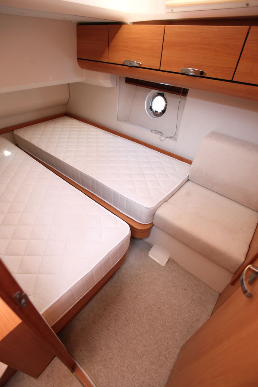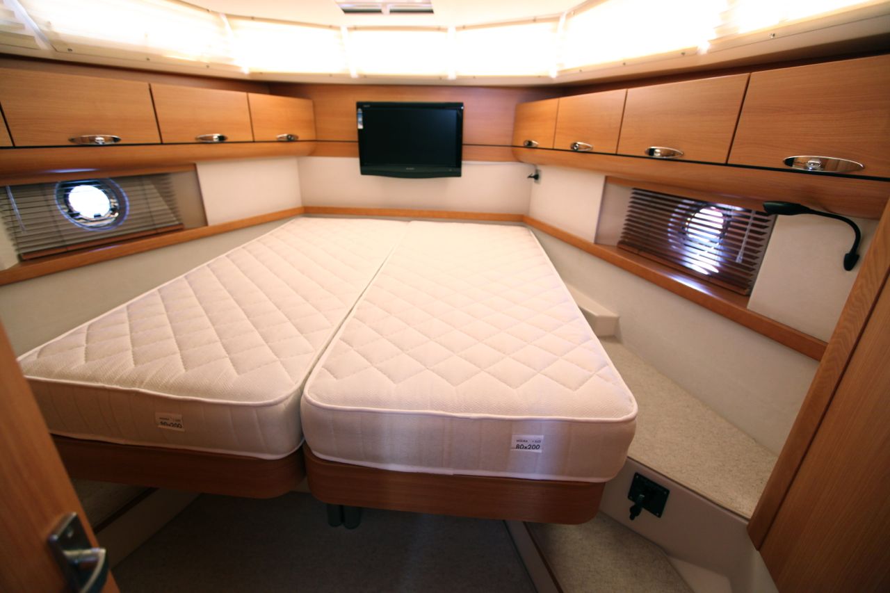 Tudi na desni, kjer je krmarjevo delovno mesto, sem opazil zanimivo rešitev, ki se je bodo razveselili predvsem tisti manjše rasti. Z eno potezo se namesti nekakšen podij, ki privzdigne tla, na katerih stoji krmar, za dobrih 10 centimetrov in tako omogoči boljši pregled nad dogajanjem. V podpalubju sta dve kabini – že omenjena, za goste z dvema posteljama na levi, in lastniška v premcu. Postelja oziroma bolje postelji, vsaka meri 80 x 200 cm, se po želji in potrebi razkleneta v ležišči v obliki črke V ali združita v veliko zakonsko posteljo. Na desni je estetska kopalnica z ločenim tušem. Omar in omaric je dovolj, izdelava je v vsej notranjosti kvalitetna in prav na tem mestu je opaziti velik napredek v primerjavi s prvimi primerki manjšega modela. Pri izbiri uporabljenega lesa pa je opaziti, da so imeli načrtovalci v mislih dostopno ceno. Posebna pozornost je namenjena varčevanju z elektriko, tudi v svetila na barki so vgrajene varčne LED žarnice.