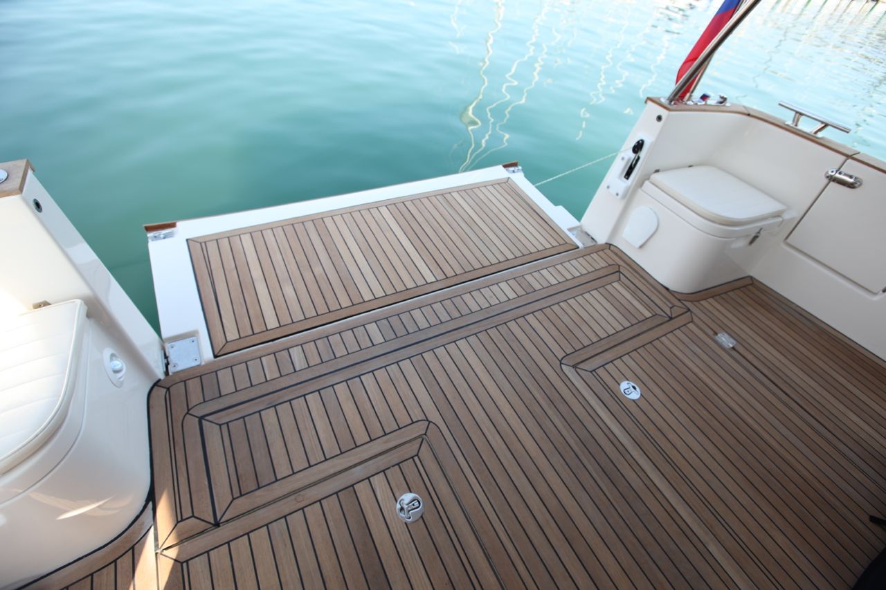 Drži, da se pri Seaway oziroma J&J dizajnu niso ravno preveč obremenjevali z iskanjem drugačnih, novih linij, kar niti ne bi bilo prav, saj je nov model zaradi nekoliko, proporcionalno gledano, nižje nadgradnje precej elegantnejši (višja ni potrebna zaradi prirastka dimenzij trupa, op. a.). Kar nekako agresivno deluje, ko se mu približamo od spredaj. Zaradi vgrajenih dveh motorjev je spremenjeno dno, ki je pri tem modelu brez kanala, posledica je sicer povečan kot osi na 7 stopinj, kar je v praksi zanemarljivo. Večji greenline je, ne le večji, temveč tudi bolj odrasel od modela 33. Prehodi po bokih so pošteno odmerjeni, v oči padejo drsna vrata na desni strani, ki krmarju omogočajo hiter prehod na bok, če je za to potreba, prostora na premcu in v kokpitu je na pretek, ko se s pritiskom na gumb odpre še krmna ploščad, se poveča prostor na nadstandardno velikost in popolnoma ravno površino, dovolj veliko za mizo, stole in ležalnike. Naj omenim še, da je vse vzorno urejeno tudi na premcu. Električni sidrni vitel, ki je mimogrede na voljo za doplačilo v muring paketu za nekaj manj kot 7.000 EUR, spušča in dviguje sidro po levi strani, kjer je nameščena tudi zaščita trupa pred udarci sidra. Da ne bo pomote, omenjeni muring paket zajema ob vseh dodatkih še bočni potisni motor na premcu z vsem potrebnim, tako da je cena kompleta kar znosna, zato vsekakor svetujem nakup te koristne opcije. Morda bo koga zmotilo, da se inox ograja na premcu ne odpira za slučaj vezanja na obalo s premcem naprej, dobro pa je izvedena močna sredinska bitev in dovolj velike uvodnice za privezne vrvi, ki vse prevečkrat zaradi neodgovornih (ali nevednih?) dizajnerjev pomenijo nevarnost za prste posadke. Pogled od zgoraj razkrije veliko drsno streho, ki se odpira električno in na hibridnih izvedbah nameščene sončne celice. V kokpit se s strani vstopa skozi vratca, ki so nameščena na obeh bokih. Testni greenline je bil po vseh zunanjih pohodnih površinah obložen z masivnim tikovim lesom, ki je na voljo za doplačilo, okoli 9.000 EUR vas bo stalo.