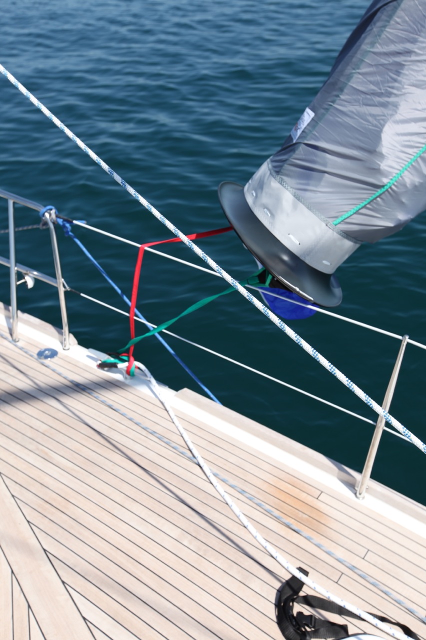Parasailor ne potrebuje tanguna, saj ima v ta namen štiri škotine. Dve sta običajni kot pri spinakerju, drugi dve pa tečeta iz kokpita po palubi in nato prek škripcev na premcu po zunanji strani do jadra ter na nek način nadomeščata pritego tanguna (basso) in omogočata stabilnost jadra. Tako lahko brez kakršnih koli postopkov, le s popuščanjem in zategovanjem škotin, jadrate približno 100 stopinj levo in desno od krme. Za sproščeno dopustniško jadranje je to fenomenalno, še bolj se bo marsikomu odvalil kamen od srca, če omenim, da svetuje proizvajalec, da v povoljne smeri jadrate brez glavnega jadra – preleta torej zagotovo ne bo in tudi nevarnosti razbitih glav ne. Enkratna je rešitev, ki je na jadru tudi najbolj vidna – horizontalno okno, ki v odvisnosti od jakosti vetra prepušča odvečnega skozi. Strah, da bi se nenadoma znašli v položaju, ko je zaradi ojačanega vetra treba jadro hitro pospraviti, je skorajda odveč.