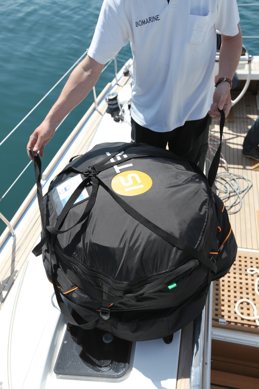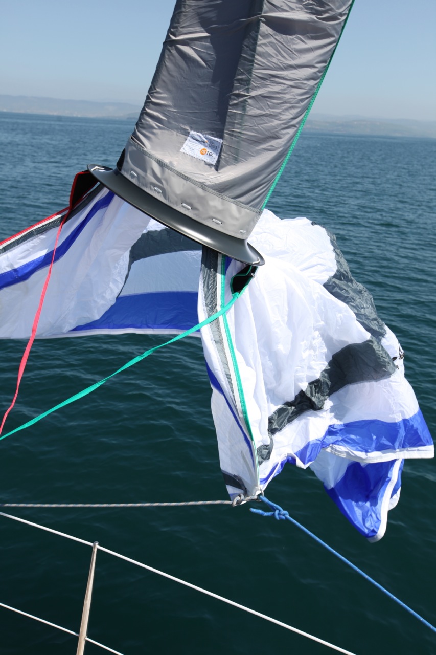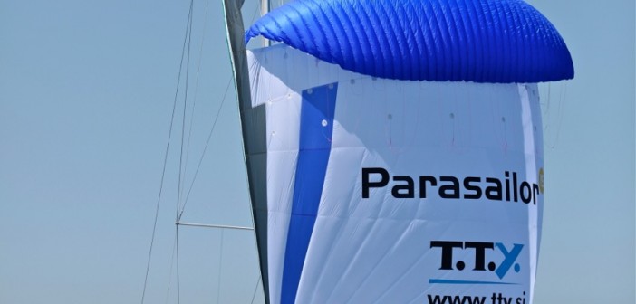 Nameščanje jadra, ki je spravljeno v občudovanja vredno torbo, traja nekoliko dlje kot pri genakerju. Dve škotini levo, dve desno in dvižnica, potem pa vrečo s spravljenim jadrom dvignemo do vrha. Šele takrat pripnemo škotine na jadro, povlečemo vrečo navzgor in jadro je odprto. Najprej je bilo nekaj nesigurnosti pri pritegovanju škotin, a zadeva je zelo logična in preprosta. Po nekaj minutah že jadramo v krmo, ko veter okrepi, se dvigne zavesica na jadru in spusti odvečni veter skozi. Vklopimo avtopilota in jadranje postane tako rekoč dolgočasno, saj Parasailor dela vse sam namesto posadke. Zato sledi test pripadanja k vetru, kjer se zopet pokažejo dobre strani, ki jih sicer poznamo pri genakerju. In zopet gre odvečen veter skozi okno v jadru, zato nas v ekstremnem kotu, ki je okoli 80 stopinj na pravi veter, ne polaga. Sicer smo med jadranjem v krmo pogrešali kakšen kvadratni meter jadra več, a je treba povedati, da je pihalo v povprečju okoli 8 vozlov, naša hitrost jadranja v krmo pa je vseeno znašala okoli 4 vozle. Odlično, če upoštevamo še dejstvo, da smo bili po navodilih zastopnika brez glavnega jadra.