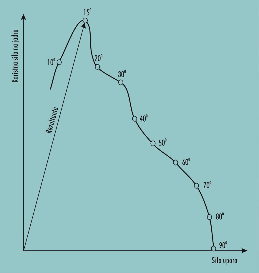 Iz grafa vidimo, da jadro postane uporabno šele pri natočnem kotu 10 stopinj, svoj najboljši izkoristek doseže pri natočnem kotu 15 stopinj, nakar koristna sila hitro pada, prav tako pa se veča sila upora. Vse to se kaže na jadrnici v spremembi hitrosti, ki pri preveč pritegnjenem jadru (velik natočni kot) hitro pada.