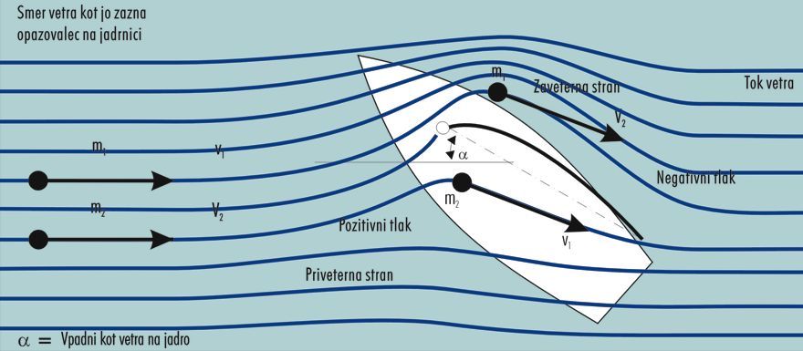 Skica 1 prikazuje poenostavljeno dogajanje na jadrnici z enim jadrom. Pri razlagi transformacije sile vetra v pogonsko silo bom uporabil čim bolj poljudno razlago, ki bi morala zadoščati rekreativnim jadralcem. Jadro ima profil letalskega krila in ko nastavimo v veter ustvari le to v zračnem toku motnjo. Delci zraka na zavetrni strani jadra se zaradi daljše poti gibljejo hitreje kot na privetrni, zaradi česar se tlak na zavetrni strani jadra zniža. Vemo da tlak, ki deluje na neko površino (v našem primeru jadro) povzroči silo, ki v našem primeru deluje pravokotno na vsak delec jadra. Vse te majhne sile na delčih jadra rezultirajo v skupni rezultanti sil, ki deluje v težišču jadra.